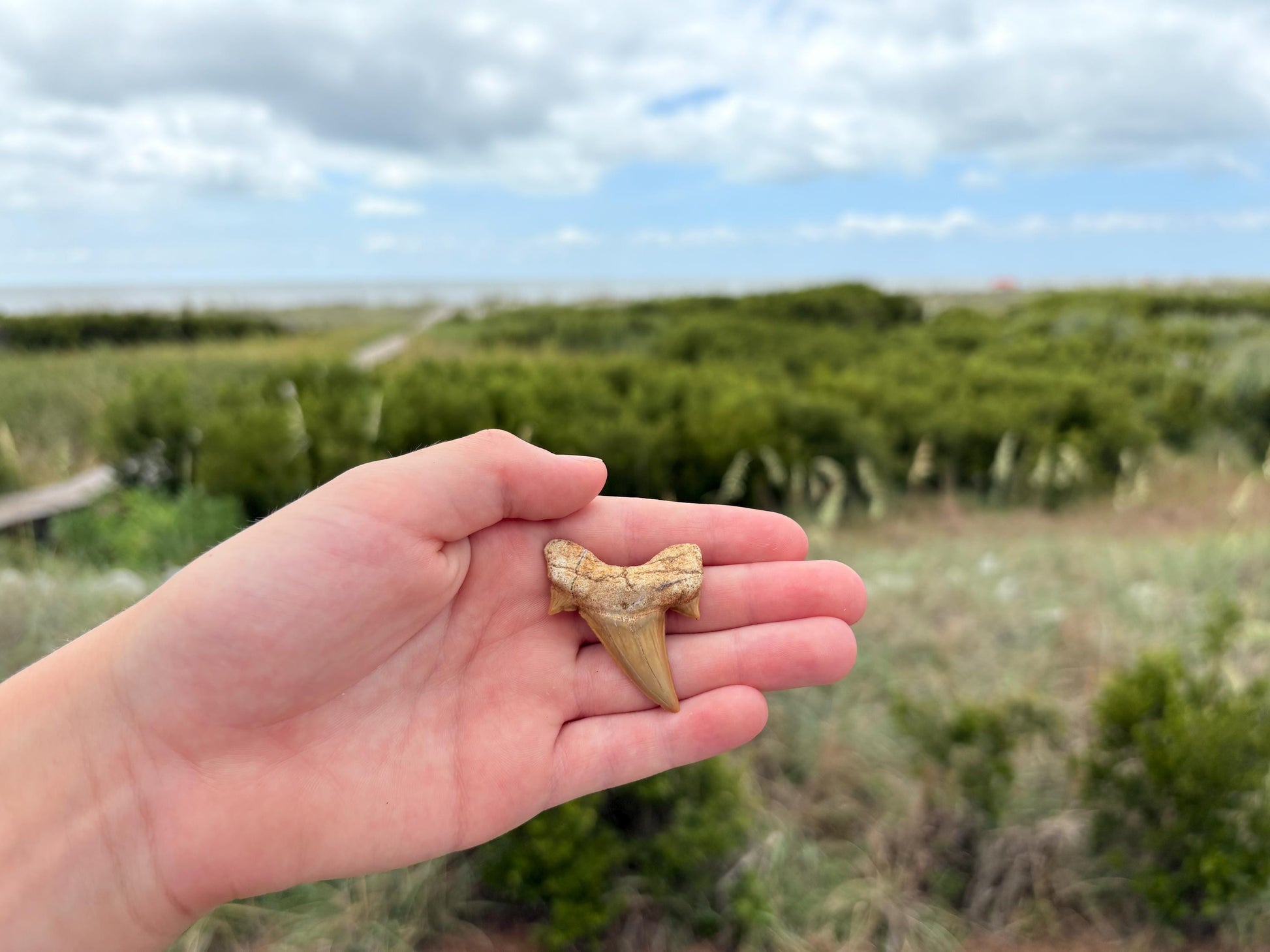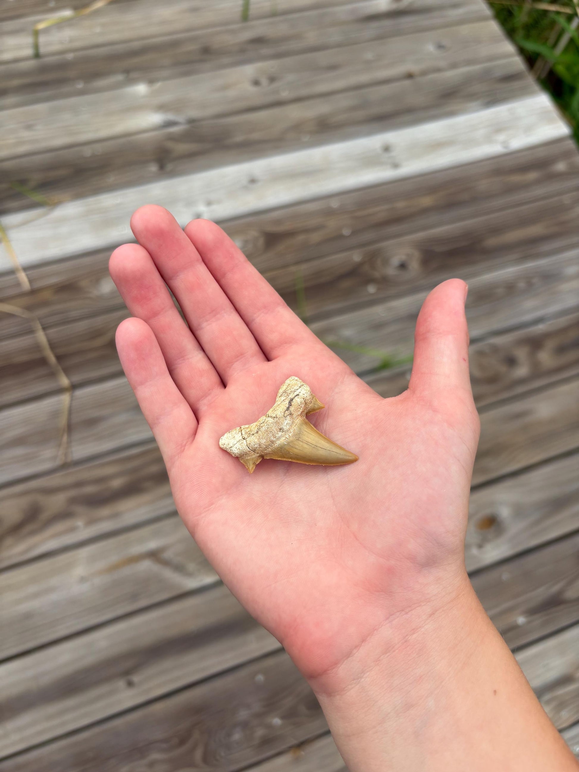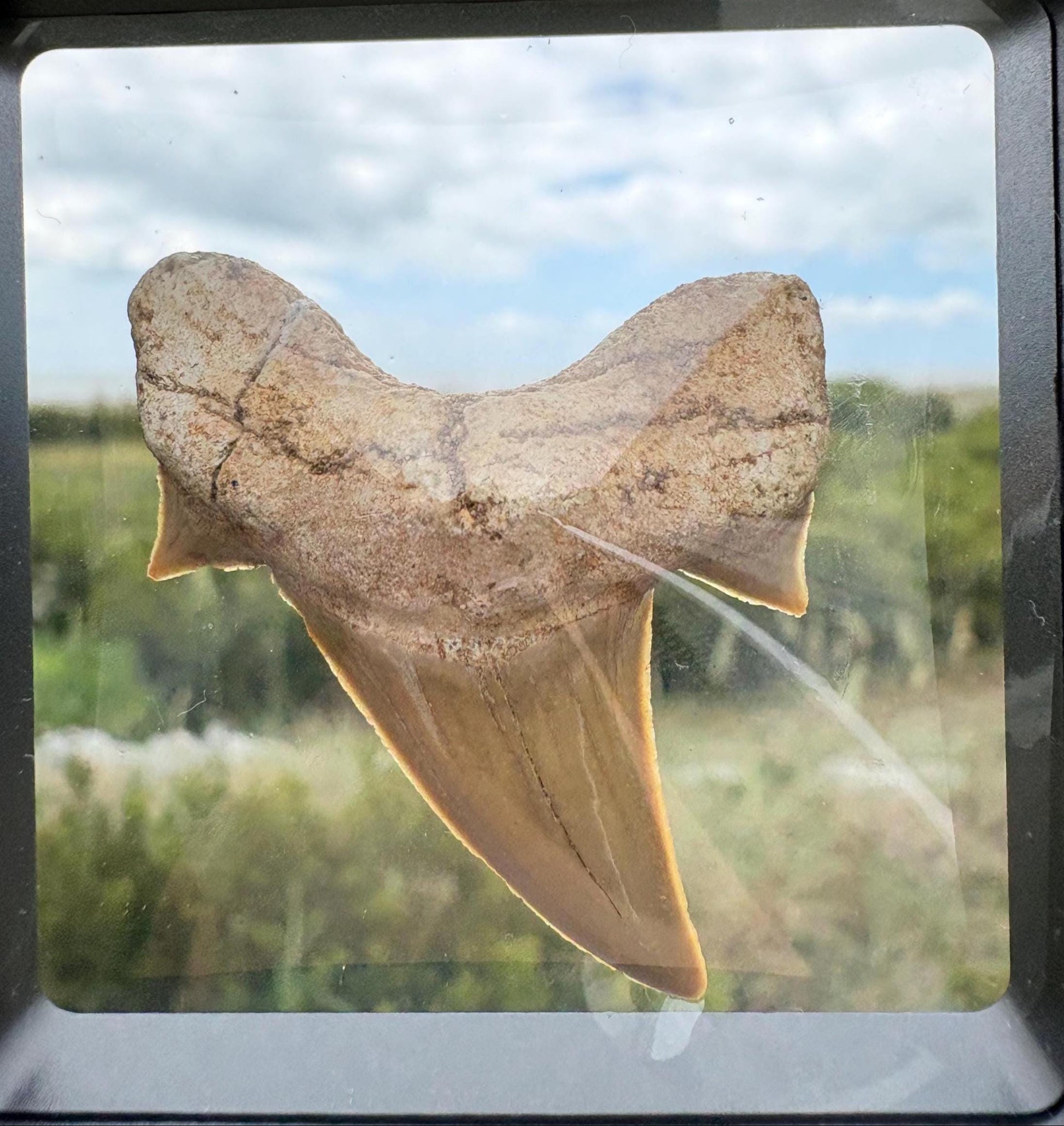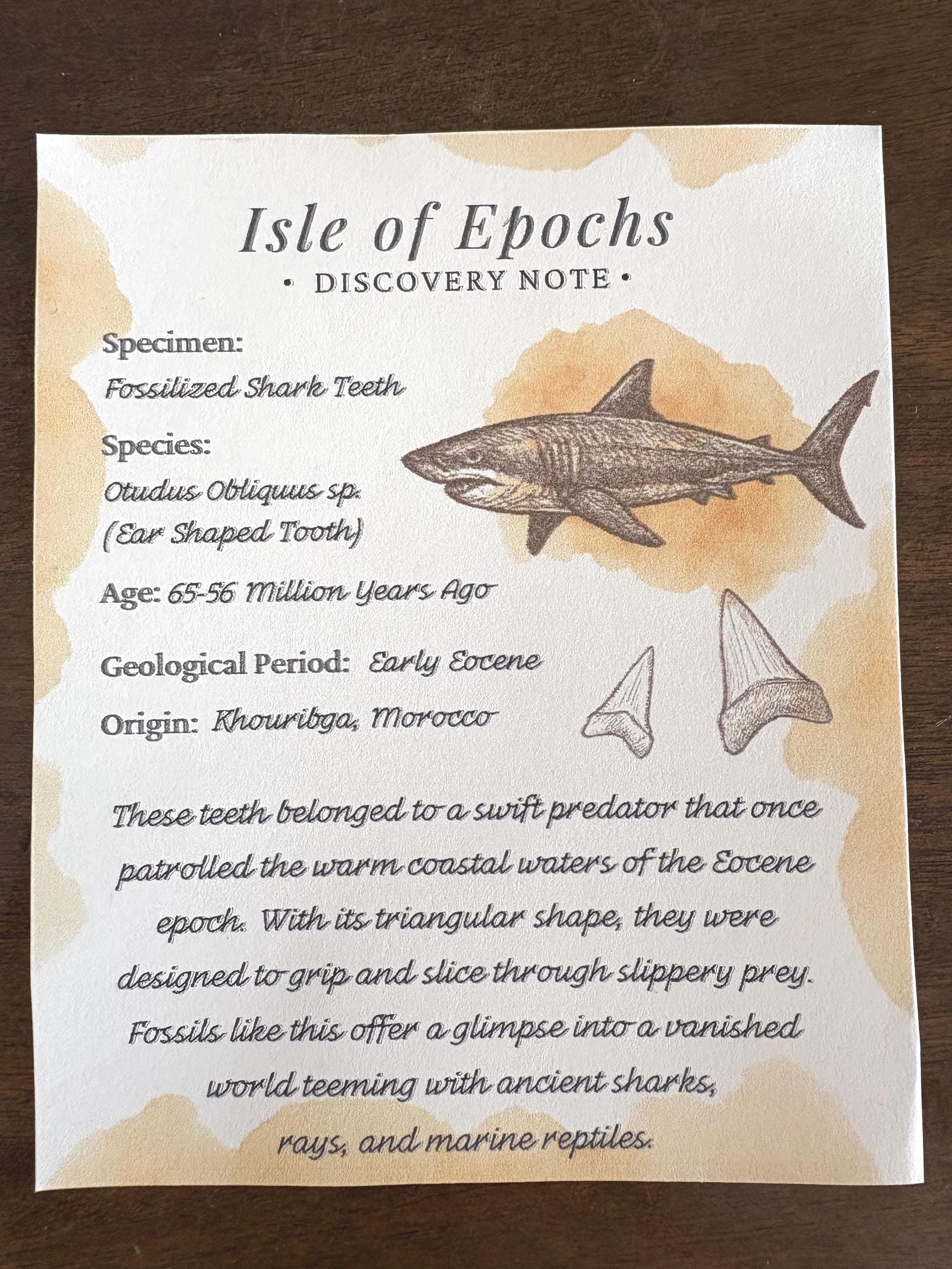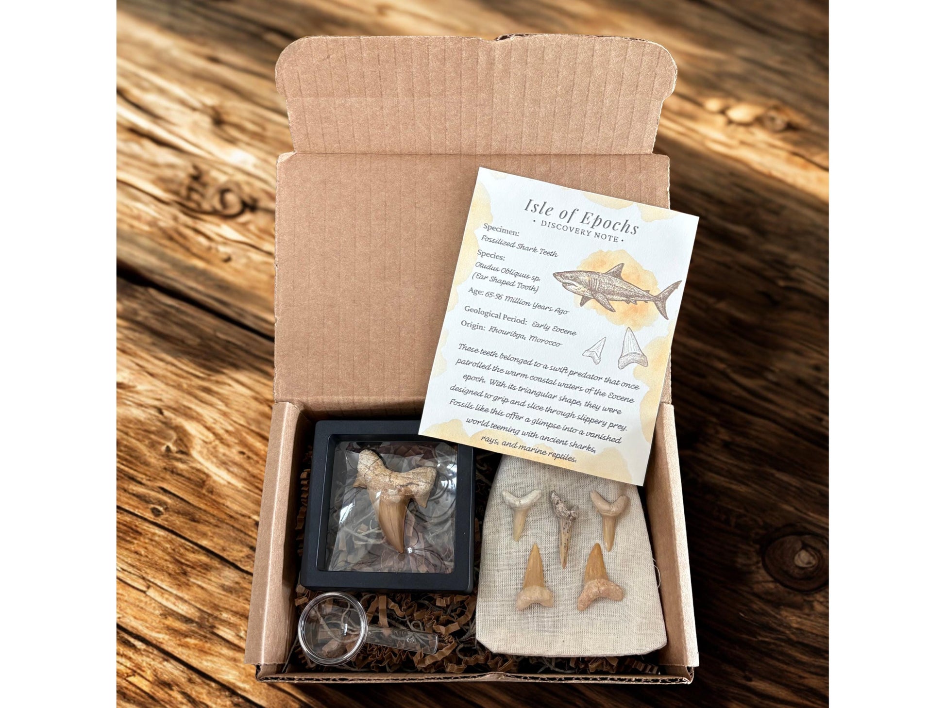 Includes one large fossil shark tooth (~2”), five smaller teeth (~1”), a magnifying glass, and a display stand — all packaged in a muslin pouch with a Discovery Note. Real fossils sourced from Morocco’s prehistoric seabeds. Perfect for collectors, gifts, or educational kits.